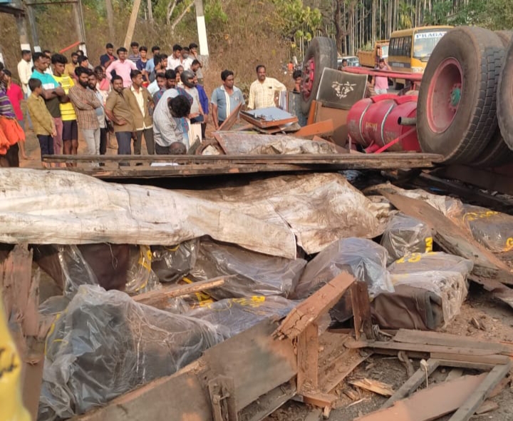 ಲಾರಿಯ ಎಲ್ಲಾ ಭಾಗಗಳು ಬೇರ್ಪಟ್ಟಿದ್ದು ರಸ್ತೆ ಬದಿಯಲ್ಲಿ ಬಿದ್ದಿದೆ.