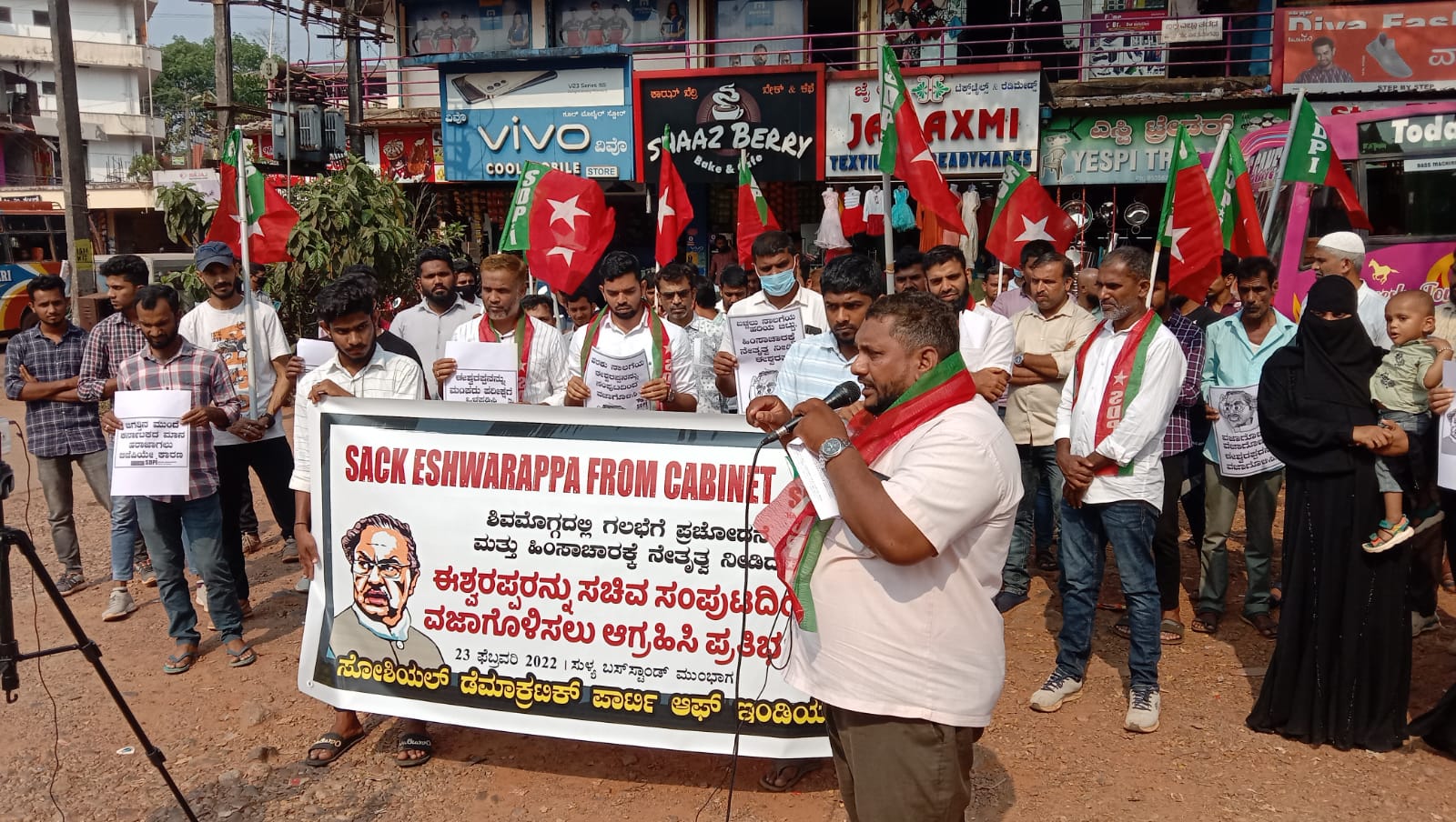 ಸುಳ್ಯ: ಸೋಶಿಯಲ್ ಡೆಮಾಕ್ರೆಟಿಕ್ ಪಾರ್ಟಿ ಆಫ್ ಇಂಡಿಯಾ ಸುಳ್ಯ ವಿಧಾನಸಭಾ ಕ್ಷೇತ್ರ ಸಮಿತಿಯ ವತಿಯಿಂದ, ಸಂಪುಟ ಸಚಿವ ಈಶ್ವರಪ್ಪ ಅವರನ್ನು ಸಂಪುಟ ಸ್ಥಾನದಿಂದ ವಜಾಗೊಳಿಸಬೇಕೆಂದು ಆಗ್ರಹಿಸಿ, ಮತ್ತು ದೇಶದ್ರೋಹಿ ಹೇಳಿಕೆಯನ್ನು ವಿರೋಧಿಸಿ ಸುಳ್ಯ ಹಳೆ ಬಸ್ ನಿಲ್ದಾಣದ ಬಳಿ ಪ್ರತಿಭಟನಾ ಸಭೆ ನಡೆಯಿತು.