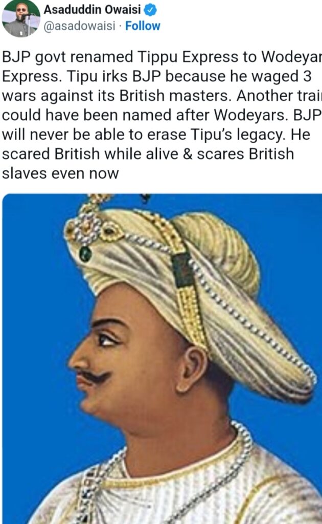 ಟಿಪ್ಪು ಎಕ್ಸ್ ಪ್ರೆಸ್ ರೈಲಿನ ಹೆಸರು ಬದಲಾವಣೆ: ಟಿಪ್ಪು ಪರಂಪರೆಯನ್ನು ಅಳಿಸಲು ಬಿಜೆಪಿಗೆ ಸಾಧ್ಯವಿಲ್ಲ; ಬಿಜೆಪಿ ಗುಡುಗಿದ ಅಸಾದುದ್ದೀನ್ ಓವೈಸಿ
