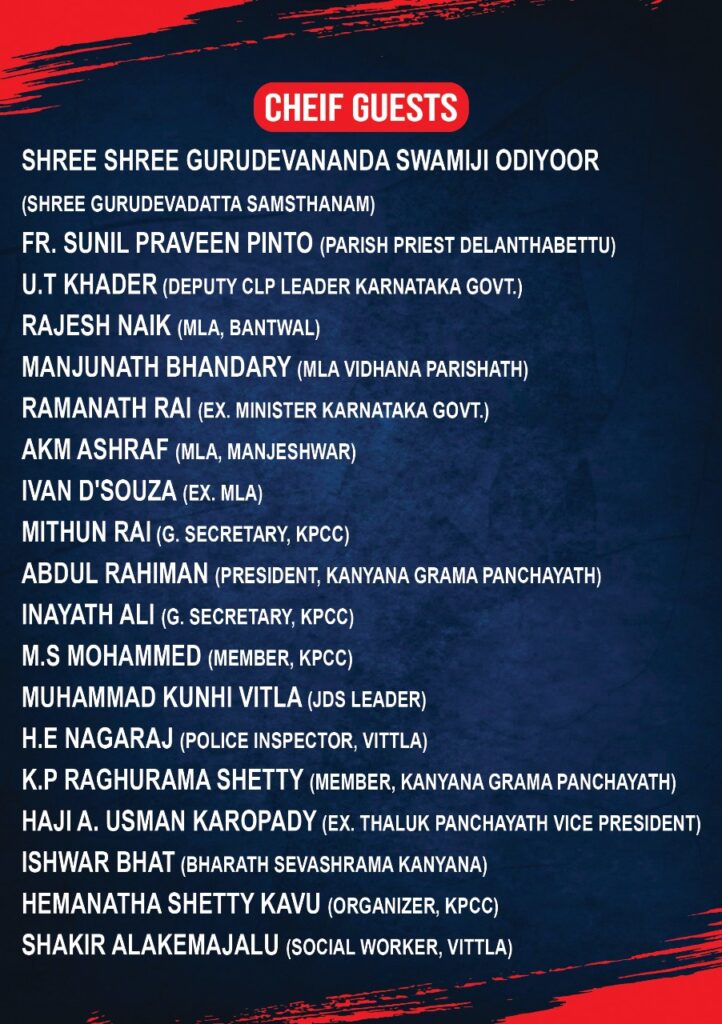 ಸಮಾರೋಪ ಕಾರ್ಯಕ್ರಮದಲ್ಲಿ ಮುಖ್ಯ ಅತಿಥಿಗಳಾಗಿ ಶ್ರೀ ಗುರುದೇವಾನಂದ ಸ್ವಾಮೀಜಿ ಒಡಿಯೂರು, ಫಾದರ್ ಸುನಿಲ್ ಪ್ರವೀಣ್ ಪಿಂಟೋ, ಯು.ಟಿ ಖಾದರ್, ರಾಜೇಶ್ ನಾಯ್ಕ್, ಮಂಜುನಾಥ್ ಬಂಡಾರಿ, ರಮಾನಾಥ ರೈ, ಎ.ಕೆ.ಎಮ್ ಅಶ್ರಫ್, ಐವನ್ ಡಿ ಸೋಜ, ಮಿಥುನ್ ರೈ, ಅಬ್ದುಲ್ ರಹಿಮಾನ್, ಇನಾಯತ್ ಅಲಿ, ಎಮ್. ಎಸ್ ಮಹಮ್ಮದ್, ಮುಹಮ್ಮದ್ ಕುಂಞ ವಿಟ್ಲ, ಹೆಚ್. ಇ. ನಾಗರಾಜ್, ಕೆ. ಪಿ ರಘುರಾಮ್ ಶೆಟ್ಟಿ, ಹಾಜಿ ಎ. ಉಸ್ಮಾನ್ ಕರೋಪಾಡಿ, ಈಶ್ವರ್ ಭಟ್, ಹೇಮನಾಥ್ ಶೆಟ್ಟಿ ಕಾವು, ಶಾಕಿರ್ ಅಳಕೆಮಜಲು ಭಾಗವಹಿಸಲಿದ್ದಾರೆ.