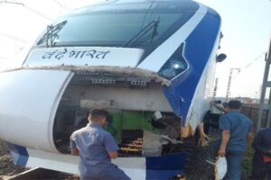 ಜಾನುವಾರುಗಳಿಗೆ ಢಿಕ್ಕಿ ಹೊಡೆದ ವಂದೇ ಭಾರತ್ ಎಕ್ಸ್ ಪ್ರೆಸ್ – ರೈಲಿನ ಮುಂಭಾಗಕ್ಕೆ ಹಾನಿ