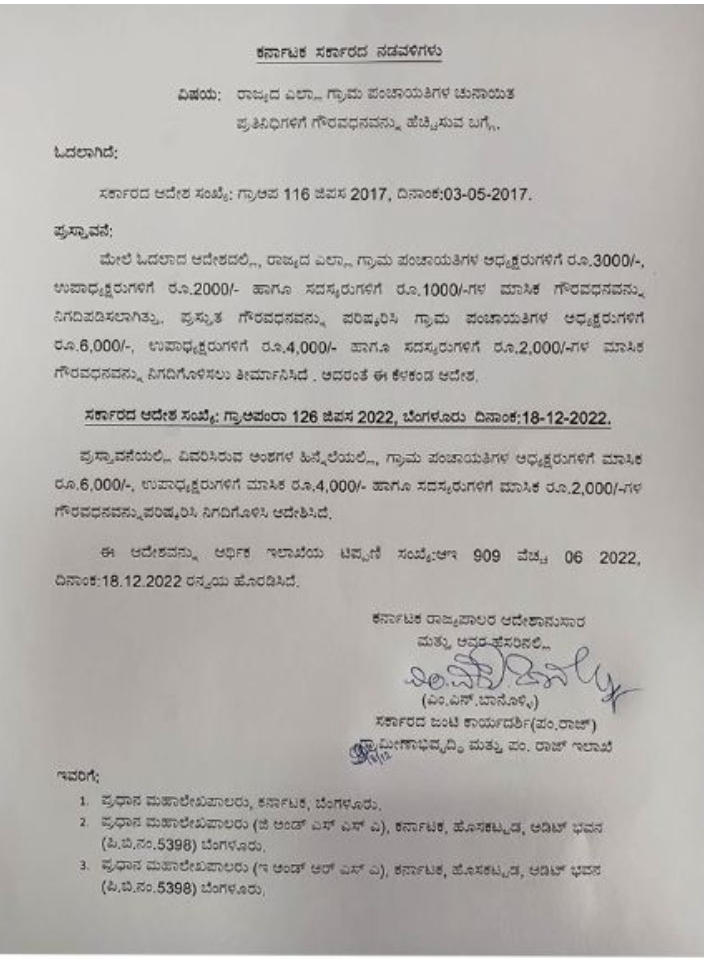 ಬೆಂಗಳೂರು: ಗ್ರಾಮ ಪಂಚಾಯತ್ ಅಧ್ಯಕ್ಷರ, ಉಪಾಧ್ಯಕ್ಷರ ಹಾಗೂ ಸದಸ್ಯರ ಮಾಸಿಕ ಗೌರವಧನವನ್ನು ಎರಡು ಪಟ್ಟು ಹೆಚ್ಚಿಸಿ ಸರ್ಕಾರ ಅಧಿಕೃತ ಆದೇಶ ಹೊರಡಿಸಿದೆ.