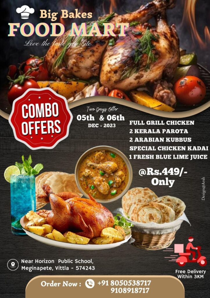 ವಿಟ್ಲ: ವಿಟ್ಲ- ಪುತ್ತೂರು ರಸ್ತೆಯ ಮೇಗಿನಪೇಟೆಯಲ್ಲಿ BIG BAKE FOOD MART ನಲ್ಲಿ ಗ್ರಾಹಕರಿಗೆ ಇಂದು ಮತ್ತು ನಾಳೆ(ಡಿ.5,6) combo ಆಫರ್ ನೀಡಲಾಗಿದೆ. ಈ combo ಆಫರ್ ನಲ್ಲಿ ರೂ. 449 ಪಾವತಿಸಿದರೆ ಫುಲ್ ಗ್ರೀಲ್ ಚಿಕನ್, 2 ಕೇರಳ ಪರೋಟ, 2 ಅರೇಬಿಯನ್ ಕುಂಬೂಸ್, ಚಿಕನ್ ಕಡಾಯಿ, ಲೈಮ್ ಜ್ಯೂಸ್ ಒಳಗೊಂಡಿರುತ್ತದೆ. ಅದಲ್ಲದೇ ಮೂರು .ಕಿ.ಮೀ ವರೆಗೆ ಉಚಿತ ಹೋಂ ಡೆಲಿವೆರಿ ವ್ಯವಸ್ಥೆ ಕಲ್ಪಿಸಲಾಗಿದೆ.