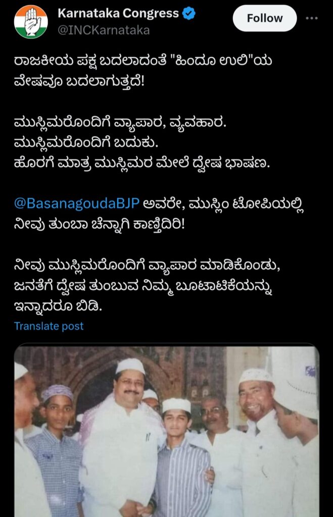 ಸಿದ್ದರಾಮಯ್ಯ ಮುಸ್ಲಿಂ ಮೌಲ್ವಿ ಮನೆಗೆ ಭೇಟಿ ನೀಡಿದ ವಿಡಿಯೋ ಹರಿಬಿಟ್ಟ ಯತ್ನಾಳ್ ಅವರಿಗೆ ಕಾಂಗ್ರೆಸ್, ಯತ್ನಾಳ್ ಅವರು ಮುಸ್ಲಿಂ ಟೋಪಿ ಹಾಕಿಕೊಂಡಿರುವ ಫೋಟೋ ಹಾಕಿ ಟಾಂಗ್ ಕೊಟ್ಟಿದೆ.