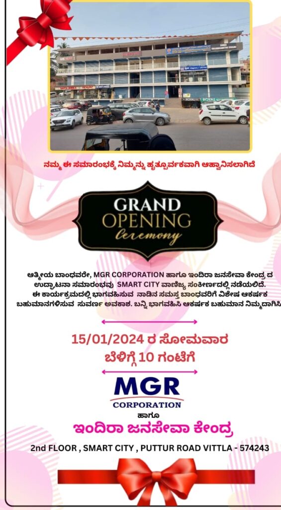 ಜ.15: ವಿಟ್ಲದಲ್ಲಿ ಎಂ.ಜಿ.ಆರ್ ಕಾರ್ಪೋರೇಶನ್ ಮತ್ತು ಇಂದಿರಾ ಜನಸೇವಾ ಕೇಂದ್ರ ಉದ್ಘಾಟನೆ: ಸ್ಮಾರ್ಟ್ ಸಿಟಿಯಲ್ಲಿ ಗಣ್ಯಾತಿಗಣ್ಯರಿಂದ ಚಾಲನೆ