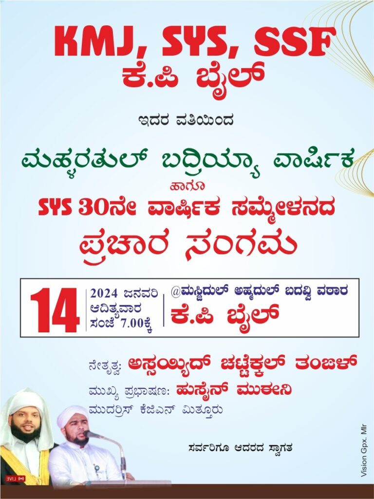 ಕೊಳ್ನಾಡು: KMJ, SYS , SSF ಕೆ ಪಿ ಬೈಲ್ ಇದರ ವತಿಯಿಂದ ದಿನಾಂಕ : 14-1-2024 ರಂದು ಮಹ್ಳರುತುಲ್ ಬದ್ರಿಯ್ಯಾ ವಾರ್ಷಿಕ ಹಾಗೂ SYS 30 ನೇ ವಾರ್ಷಿಕ ಸಮ್ಮೇಳನದ ಪ್ರಚಾರ ಸಂಗಮವು ಮುತ್ತಲಿಬ್ ಹಾಜಿ ಇವರ ಅಧ್ಯಕ್ಷತೆಯಲ್ಲಿ ಕೆ ಪಿ ಬೈಲ್ ಮಸ್ಜಿದ್ ಅಹ್ಮದುಲ್ ಬದವ್ವಿ ವಠಾರದಲ್ಲಿ ನಡೆಯಲಿದೆ.