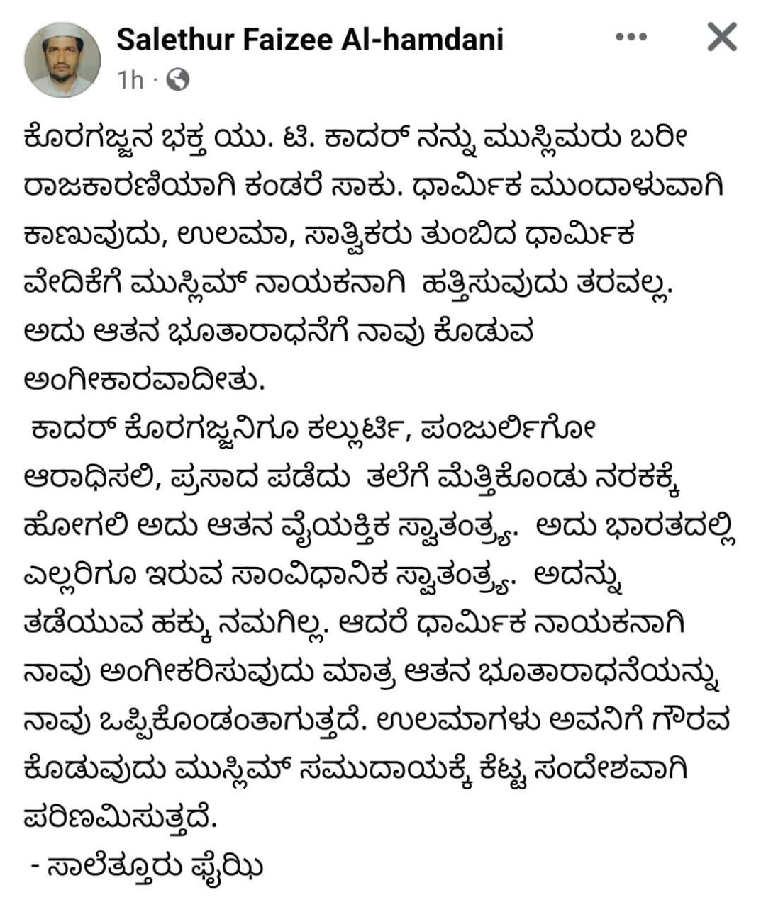 ಮುಸ್ಲಿಂ ಧಾರ್ಮಿಕ ಮುಖಂಡ ಸಾಲೆತ್ತೂರು ಫೈಝಿ ಎಂಬುವವರು ಯು.ಟಿ. ಖಾದರ್ ಬಗ್ಗೆ ಆಕ್ಷೇಪಿಸಿ ಸಾಮಾಜಿಕ ಜಾಲತಾಣದಲ್ಲಿ ಪೋಸ್ಟ್ ಹಾಕಿದ್ದಾರೆ. ‘ಕೊರಗಜ್ಜನ ಭಕ್ತ ಯು.ಟಿ ಖಾದರ್ ನನ್ನು ಮುಸ್ಲಿಮರು ಬರೀ ರಾಜಕಾರಣಿಯಾಗಿ ಕಂಡರೆ ಸಾಕು. ಧಾರ್ಮಿಕ ಮುಖಂಡರಾಗಿ ಕಾಣುವುದು ಬೇಡ. ಉಲೆಮಾ, ಸಾತ್ವಿಕರು ತುಂಬಿದ ಧಾರ್ಮಿಕ ವೇದಿಕೆಗೆ ಮುಸ್ಲಿಂ ನಾಯಕನಾಗಿ ಹತ್ತಿಸುವುದು ತರವಲ್ಲ. ಅದು ಆತನ ಭೂತಾರಾಧನೆಗೆ ನಾವು ಕೊಡುವ ಅಂಗೀಕಾರವಾಗಿತ್ತೆ. ಖಾದರ್ ಕೊರಗಜ್ಜನಿಗೂ ಕಲ್ಲುರ್ಟಿ, ಪಂಜುರ್ಲಿಗೂ ಆರಾಧಿಸಲಿ. ಪ್ರಸಾದ ಪಡೆದು ತಲೆಗೆ ಮೆತ್ತಿಕೊಂಡು ನರಕಕ್ಕೆ ಹೋಗಲಿ. ಅದು ಆತನ ವೈಯಕ್ತಿಕ ಸ್ವಾತಂತ್ರ್ಯ. ಅದು ಭಾರತದಲ್ಲಿ ಎಲ್ಲರಿಗೂ ಇರುವ ಸಂವಿಧಾನಿಕ ಸ್ವಾತಂತ್ರ. ಅದನ್ನು ತಡೆಯುವ ಹಕ್ಕು ನನಗಿಲ್ಲ. ಆದರೆ ಧಾರ್ಮಿಕ ನಾಯಕನಾಗಿ ನಾವು ಅಂಗೀಕರಿಸುವುದು, ಆತನ ಭೂತಾರಾಧನೆಯನ್ನು ನಾವು ಒಪ್ಪಿಕೊಂಡಂತಾಗುತ್ತದೆ. ಉಲಮಾಗಳು ಅವನಿಗೆ ಗೌರವ ಕೊಡುವುದು ಮುಸ್ಲಿಂ ಸಮುದಾಯಕ್ಕೆ ಕೆಟ್ಟ ಸಂದೇಶವಾಗಿ ಪರಿಣಮಿಸುತ್ತದೆ ಎಂದು ಯು.ಟಿ.ಖಾದರ್ ನಡವಳಿಕೆ ಆಕ್ಷೇಪಿಸಿ ಸಾಲೆತ್ತೂರು ಫೈಝಿ ಪೋಸ್ಟ್ ಹಂಚಿಕೊಂಡಿದ್ದಾರೆ.