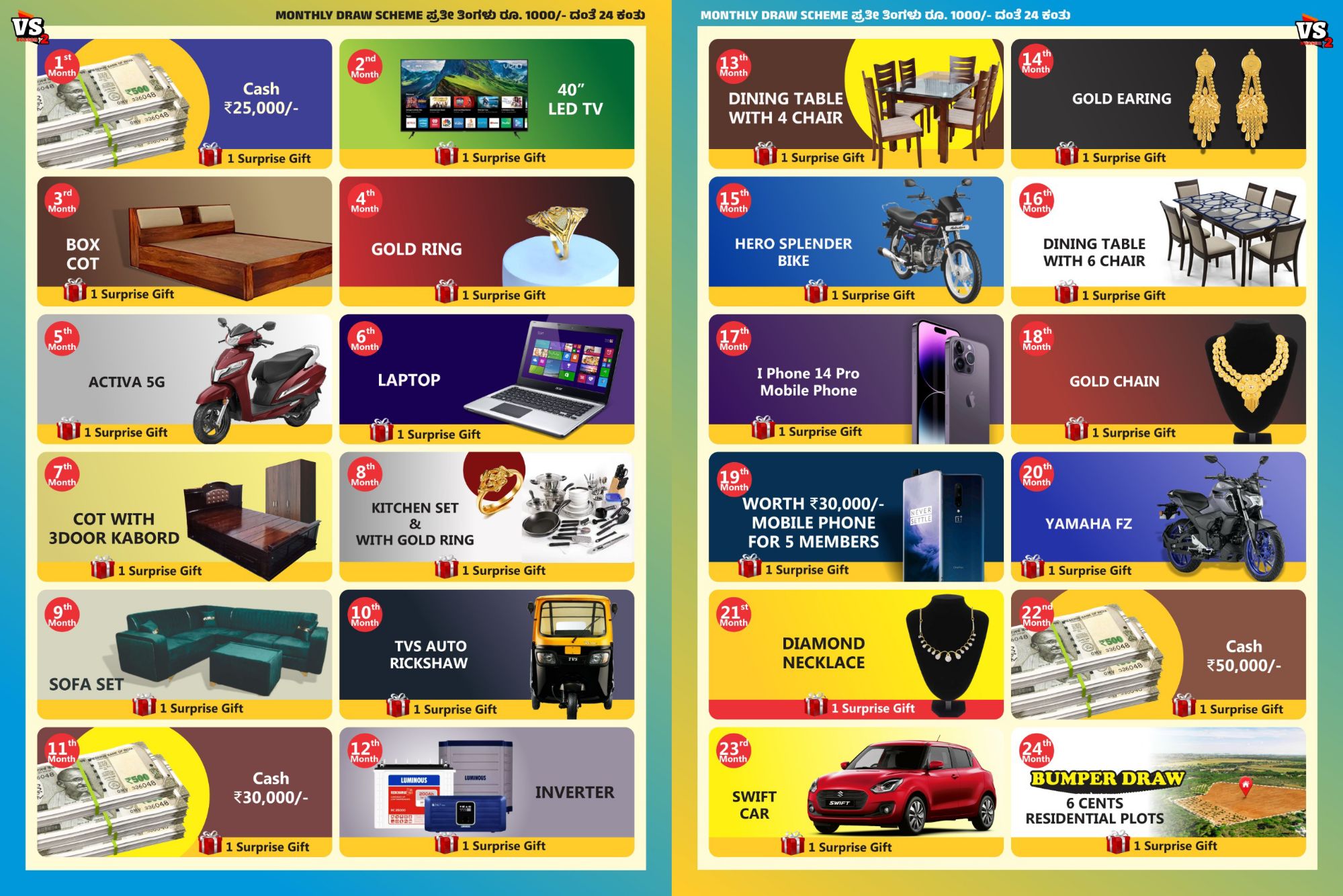ಬಹುಮಾನಗಳ ವಿವರ: RESIDENTIAL PLOTS (6 ಸೆನ್ಸ್), MARUTHI SWIFT CAR, TVS AUTO RICKSHAW, YAMAHA FZ BIKE, HERO SPLENDER BIKE, ACTIVE 5G ಜೊತೆಗೆ , ಚಿನ್ನ, ಡೈಮಂಡ್, ಐಫೋನ್ ಹೀಗೆ ಬಹುಮಾನಗಳನ್ನು ಗೆಲ್ಲುವ ಅವಕಾಶ ಸಿಗಲಿದೆ.