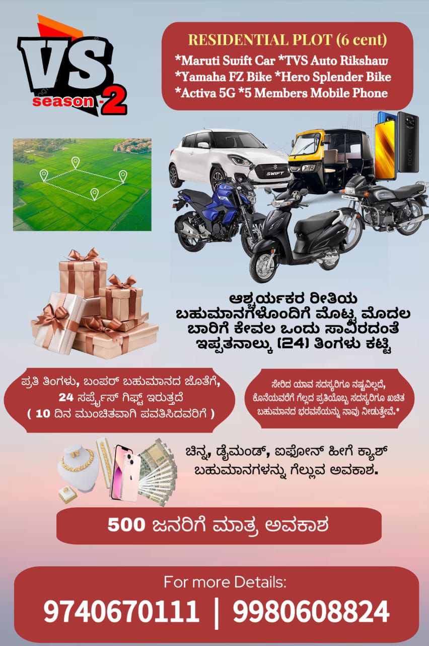 ನಿಮ್ಮ ಕನಸನ್ನು ನನಸಾಗಿಸಲು vs ಸ್ಕೀಮ್ ಜೊತೆ ಕೈ ಜೋಡಿಸಿ. ಪ್ರಪ್ರಥಮ ಬಾರಿಗೆ ವಿ. ಎಸ್ ಸಂಸ್ಥೆಯು ಜನರಿಗೆ ನೀಡುತ್ತಿದೆ ಬಿಗ್ ಆಫರ್. ಜಾಗ, ಮೂರು ಟೂವೀಲರ್, ಕಾರು, ಆಟೋ ರಿಕ್ಷಾ, ಚಿನ್ನ, ಡೈಮಂಡ್,,ಕ್ಯಾಶ್ ಪ್ರೈಜ್,ಮುಂತಾದ ಹತ್ತು ಹಲವು ಬಂಪರ್ ಡ್ರಾಗಳು ಇಂದೇ ನಿಮ್ಮ ಹೆಸರನ್ನು ಖಾತ್ರಿಪಡಿಸಿಕೊಳ್ಳಿ, ಈ ಗ್ರೂಪಿನ ಅಡ್ಮಿನ್ಗೆ ಕರೆ ಅಥವಾ ವಾಟ್ಸಪ್ ಮೂಲಕ ಮೇಸೆಜ್ ಮಾಡಬಹುದು. ತಡಮಾಡಬೇಡಿ, ಈಗಲೇ ರಿಜಿಸ್ಟರ್ ಮಾಡಿಕೊಳ್ಳಿ.