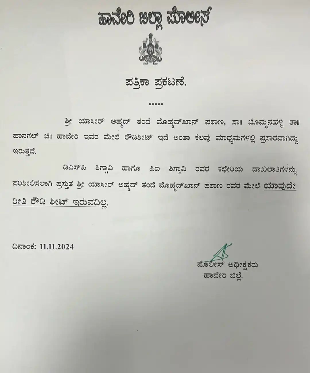 ಈ ಕುರಿತಂತೆ ಹಾವೇರಿ ಜಿಲ್ಲಾ ಅಧೀಕ್ಷಕರು ಪತ್ರಿಕಾ ಪ್ರಕಟಣೆಯಲ್ಲಿ ಮಾಹಿತಿ ಹಂಚಿಕೊಂಡಿದ್ದು, ಯಾಸೀರ್ ಅಹ್ಮದ್ ತಂದೆ ಮೊಹ್ಮದ್ ಖಾನ್ ಪಠಾಣ, ಬೊಮ್ಮನಹಳ್ಳಿ, ಹಾನಗಲ್ ತಾಲ್ಲೂಕು, ಹಾವೇರಿ ಜಿಲ್ಲೆ ಇವರ ಮೇಲೆ ರೌಡಿ ಶೀಟ್ ಇದೆ ಅಂತ ಕೆಲವು ಮಾಧ್ಯಮಗಳಲ್ಲಿ ಪ್ರಸಾರವಾಗಿದ್ದು ಇರುತ್ತದೆ ಎಂದಿದ್ದಾರೆ. ಡಿಎಸ್ಪಿ ಶಿಗ್ಗಾವಿ ಹಾಗೂ ಪಿಐ ಶಿಗ್ಗಾವಿ ಅವರ ಕಚೇರಿಯ ದಾಖಲಾತಿಗಳನ್ನು ಪರಿಶೀಲಿಸಲಾಗಿ, ಪ್ರಸ್ತುತ ಯಾಸೀರ್ ಅಹ್ಮದ್ ತಂದೆ ಮೊಹಮ್ಮದ್ ಖಾನ್ ಪಠಾಣ ಅವರ ಮೇಲೆ ಯಾವುದೇ ರೀತಿ ರೌಡಿ ಶೀಟ್ ಇರುವುದಿಲ್ಲ ಎಂಬುದಾಗಿ ಹಾವೇರಿ ಪೊಲೀಸ್ ಅಧೀಕ್ಷಕರು ಸ್ಪಷ್ಟ ಪಡಿಸಿದ್ದಾರೆ.