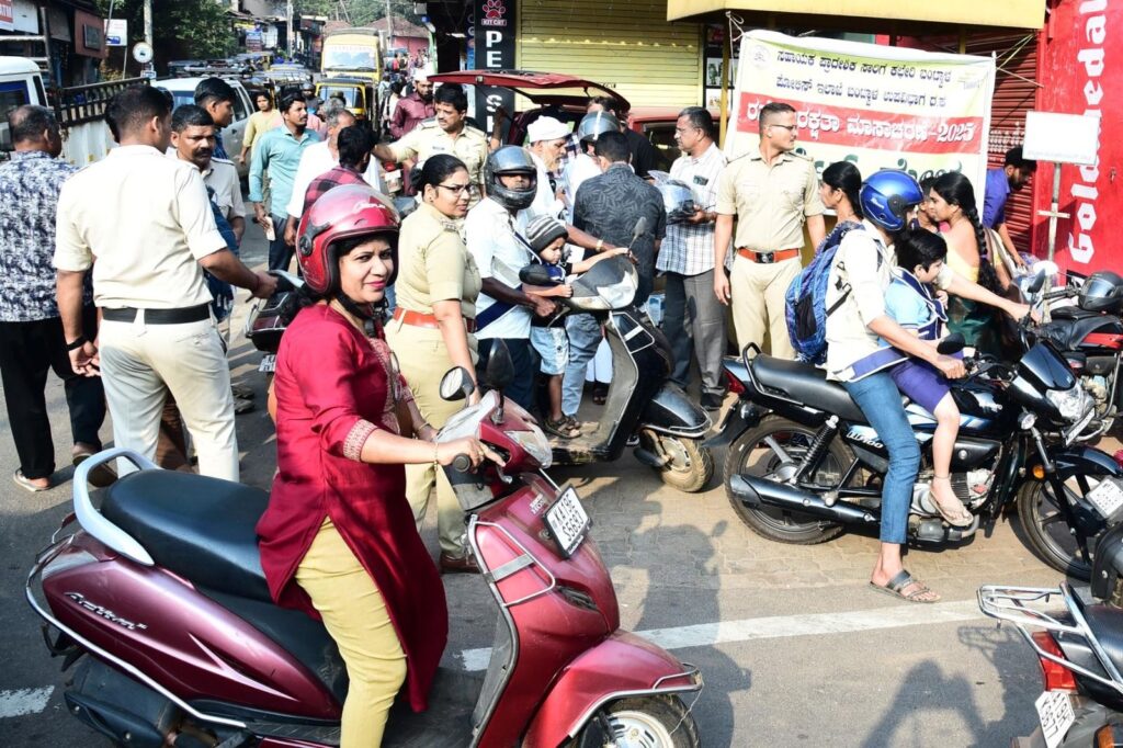 ದ್ವಿಚಕ್ರ ವಾಹನಗಳ ಹಿಂಬದಿ ಸವಾರರಿಗೂ ಹೆಲ್ಮೆಟ್ ಕಡ್ಡಾಯವಾಗಿದ್ದರೂ ಬೇಕಾಬಿಟ್ಟಿಯಾಗಿ ನಿಯಮ ಉಲ್ಲಂಘಿಸುವ ಸವಾರರಿಗೆ ಇಂದಿನ ಕಾರ್ಯಾಚರಣೆ ಬಿಸಿ ಮುಟ್ಟಿಸಿದೆ. ಮಾಸಾಚರಣೆ ಅಂಗವಾಗಿ ಯಾವುದೇ ದಂಡ ವಿಧಿಸಿದೇ ಸವಾರರಿಗೆ ಕಾನೂನಿನ ಬಗ್ಗೆ ವಿವರಿಸಿದ ಅಧಿಕಾರಿಗಳು ಮಿತಿ ದರದಲ್ಲಿ ತಲಾ ಐನೂರರಂತೆ ಹೆಲ್ಮೆಟ್ ಪಡೆಯಲು ಸೂಚಿಸಿದರು.