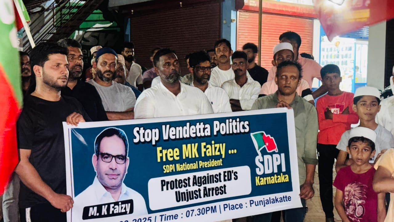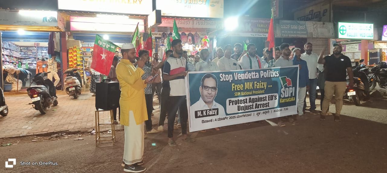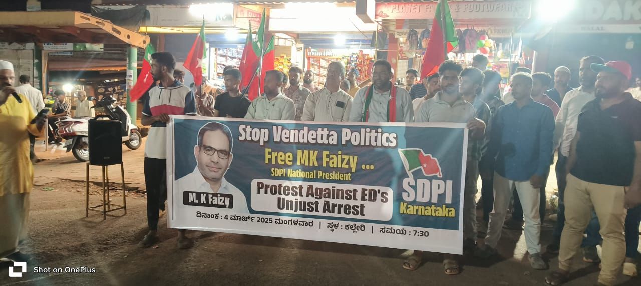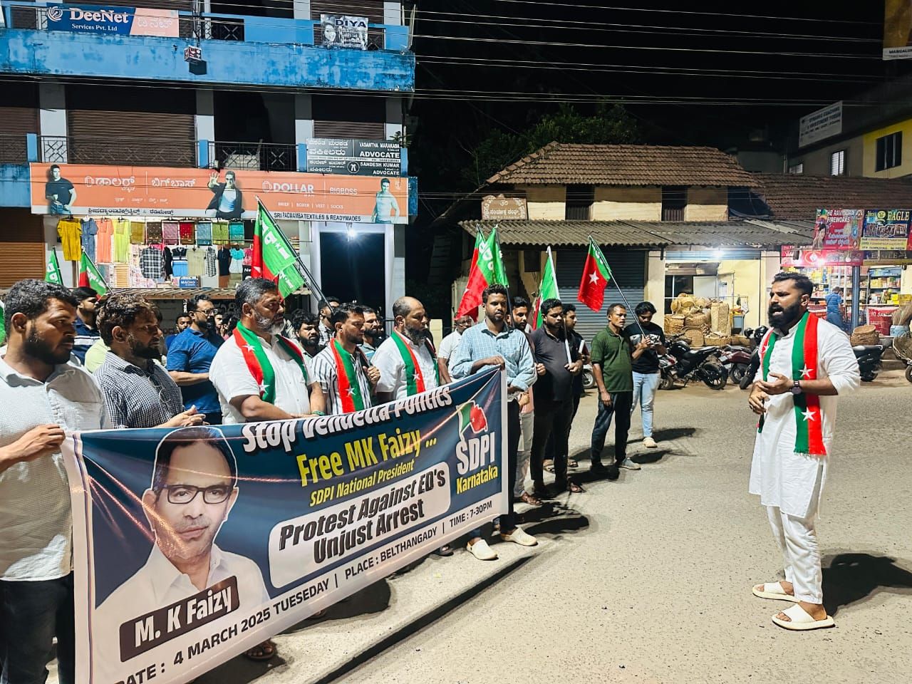 ಬೆಳ್ತಂಗಡಿ: ಸೋಶಿಯಲ್ ಡೆಮಾಕ್ರಟಿಕ್ ಪಾರ್ಟಿ ಆಫ್ ಇಂಡಿಯಾ ರಾಷ್ಟ್ರೀಯ ಅಧ್ಯಕ್ಷರಾದ ಎಂ. ಕೆ ಫೈಝಿ ಯವರನ್ನು ಕೇಂದ್ರ ಸರ್ಕಾರವು ದೆಹಲಿಯಲ್ಲಿ ಅಕ್ರಮ ಬಂಧನ ಮಾಡಿರುವುದರ ವಿರುದ್ಧ ಎಸ್ಡಿಪಿಐ ಬೆಳ್ತಂಗಡಿ ವಿಧಾನಸಭಾ ಕ್ಷೇತ್ರ ಸಮಿತಿ ವತಿಯಿಂದ ಅಕ್ಬರ್ ಬೆಳ್ತಂಗಡಿ ನೇತೃತ್ವದಲ್ಲಿ ಬೆಳ್ತಂಗಡಿ ಮೂರು ಮಾರ್ಗದ ಬಳಿ ರಾತ್ರಿ ಪ್ರತಿಭಟನೆ ನಡೆಯಿತು.