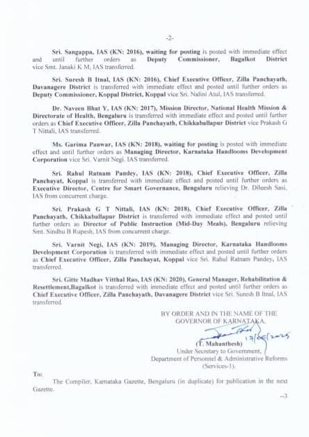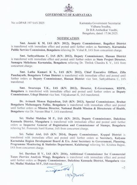 ಮುಲ್ಲೈ ಮುಗಿಲನ್ ಅವರನ್ನು ಇನ್ಸ್ಪೆಕ್ಟರ್ ಜನರಲ್ ಆಫ್ ರಿಜಿಸ್ಟ್ರೇಷನ್ ಆಂಡ್ ಸ್ಟಾಂಪ್ಸ್ ಆಯುಕ್ತರಾಗಿ ವರ್ಗಾವಣೆ ಮಾಡಲಾಗಿದೆ. ದಕ್ಷಿಣ ಕನ್ನಡ ಜಿಲ್ಲೆಯ ನೂತನ ಜಿಲ್ಲಾಧಿಕಾರಿಯಾಗಿರುವ ದರ್ಶನ್ ಎಚ್ವಿ ವಾಣಿಜ್ಯ ತೆರಿಗೆಗಳ ಹೆಚ್ಚುವರಿ ಆಯುಕ್ತರಾಗಿದ್ದರು.