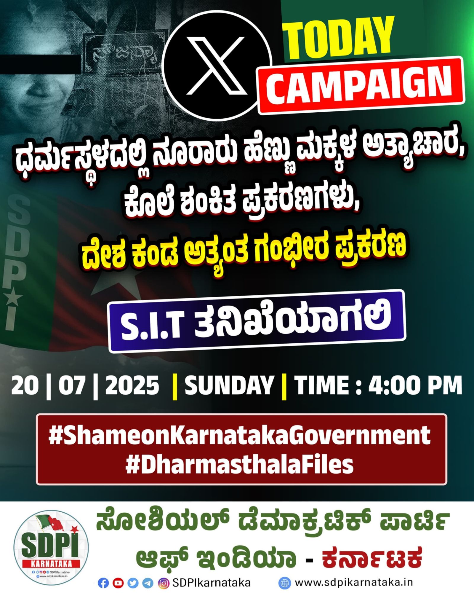 “ಧರ್ಮಸ್ಥಳದಲ್ಲಿ ನೂರಾರು ಹೆಣ್ಣು ಮಕ್ಕಳ ಅತ್ಯಾಚಾರ, ಕೊಲೆ ಪ್ರಕರಣಗಳು ದೇಶ ಕಂಡ ಅತ್ಯಂತ ಗಂಭೀರ ಪ್ರಕರಣ” ಎನ್ನುವ ಪೋಸ್ಟರ್ ವೈರಲ್ ಮಾಡುತ್ತಿರುವ ಎಸ್ ಡಿ ಪಿ ಐ #ShameonKarnatakaGovernment #DharmasthalaFiles ಎಂಬ ಹ್ಯಾಶ್ ಟ್ಯಾಗ್ ನೊಂದಿಗೆ ಅಭಿಯಾನ ನಡೆಸಲಿದೆ.