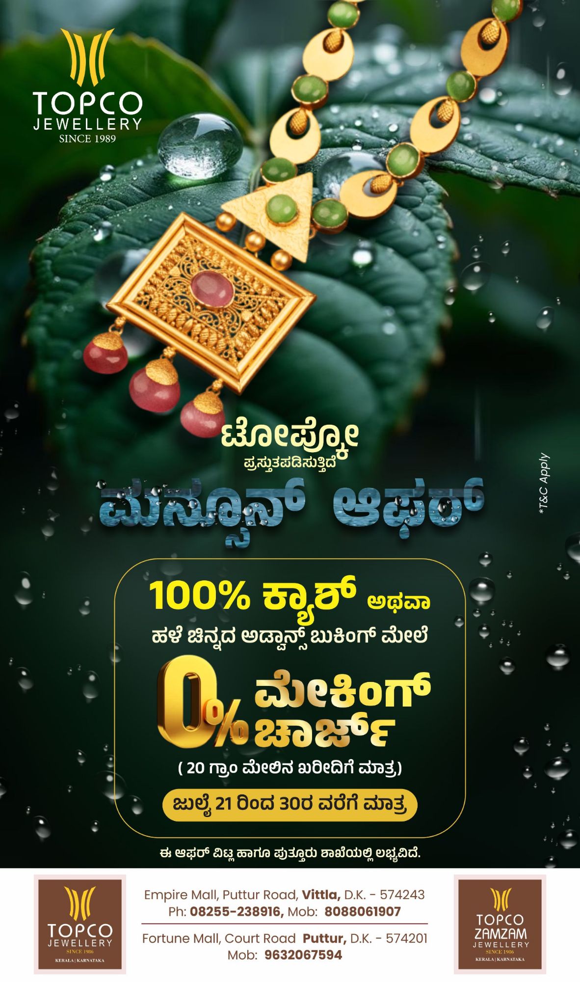 ಹೌದು…ಟೋಪ್ಕೋ ಜುವೆಲರಿಯು ವಿಟ್ಲ ಹಾಗೂ ಪುತ್ತೂರು ಶಾಖೆಯಲ್ಲಿ ಮನ್ಸೂನ್ ಆಫರ್ ಇದೆ.