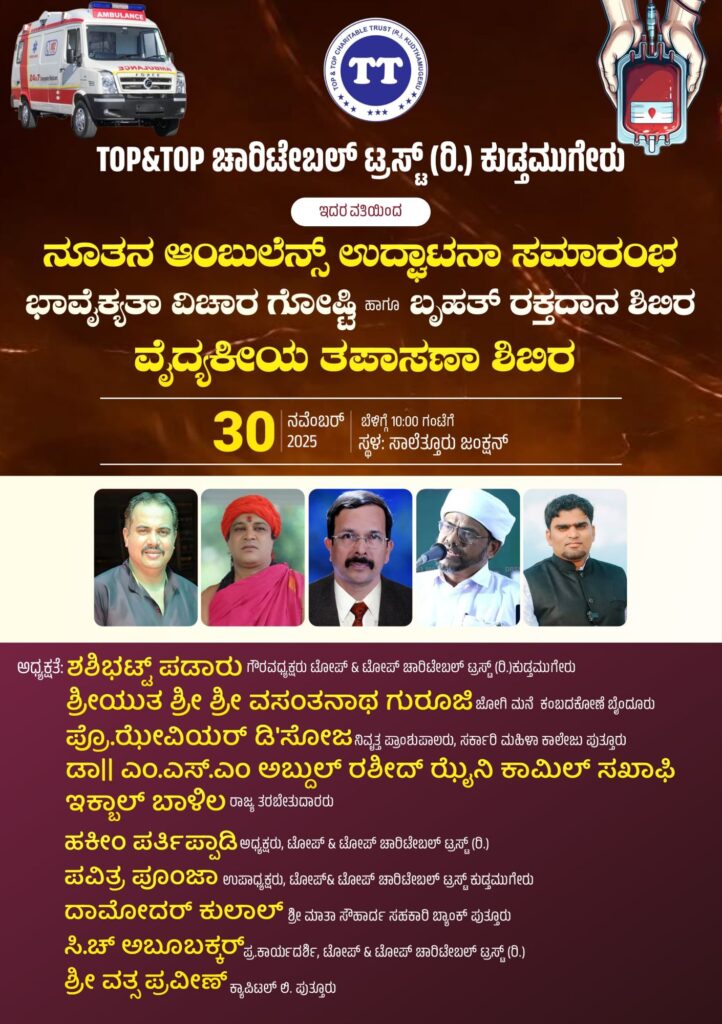 ನಾಳೆ ನ.30ರಂದು ಕುಡ್ತಮುಗೇರು TOP ಆ್ಯಂಡ್ TOP ಚಾರಿಟೇಬಲ್ ಟ್ರಸ್ಟ್ ವತಿಯಿಂದ ನೂತನ ಆಂಬುಲೆನ್ಸ್ ಉದ್ಘಾಟನಾ ಸಮಾರಂಭ: ಭಾವೈಕ್ಯತಾ ವಿಚಾರಗೋಷ್ಠಿ ಹಾಗೂ ಆರೋಗ್ಯ ತಪಾಸಣಾ ಶಿಬಿರ