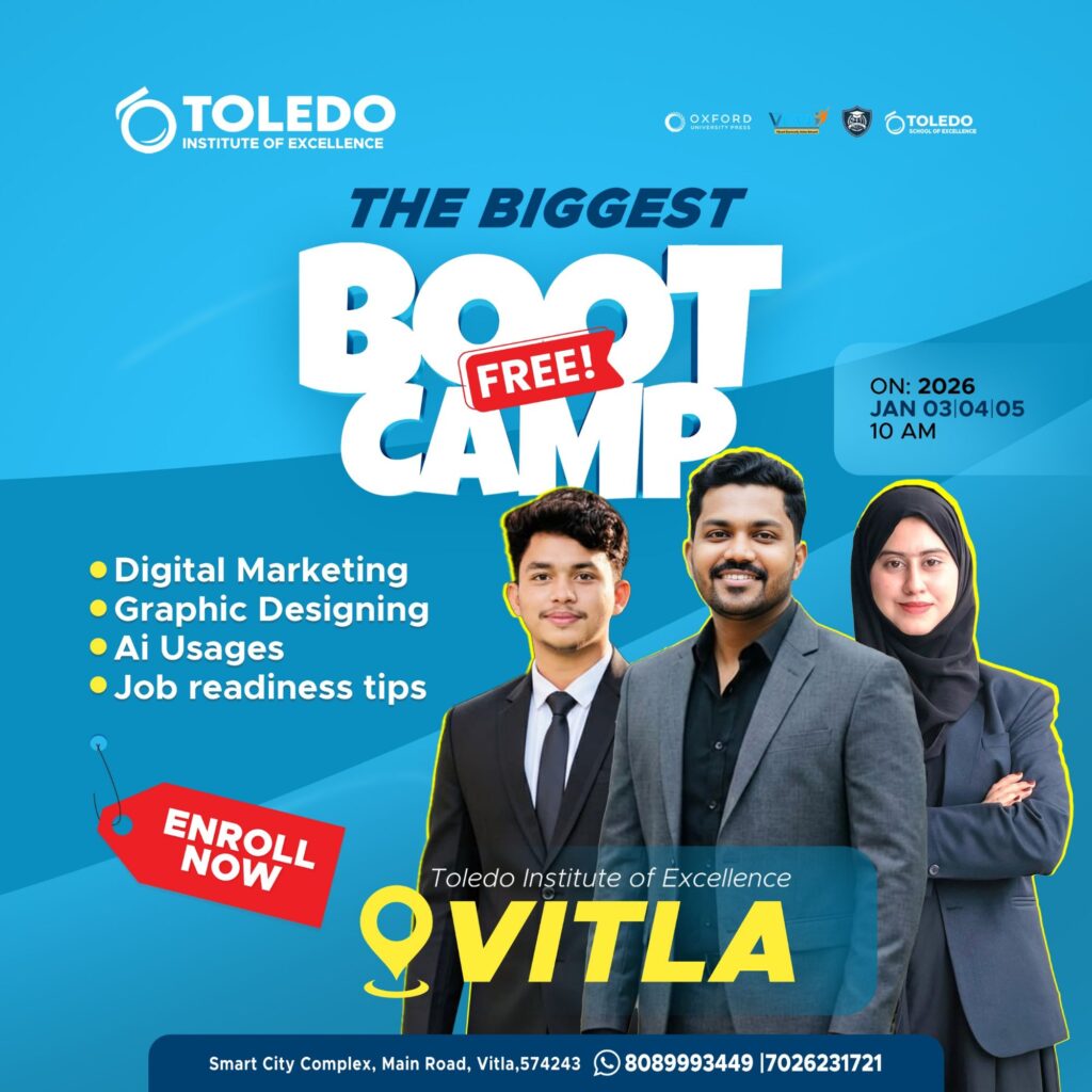 ವಿಟ್ಲ: ಮಹಿಳೆಯರನ್ನು ತಂತ್ರಜ್ಞಾನ ಹಾಗೂ ಉದ್ಯೋಗ ಕ್ಷೇತ್ರದಲ್ಲಿ ಸಬಲಗೊಳಿಸುವ ಉದ್ದೇಶದಿಂದ Toledo Institute of Excellence ವತಿಯಿಂದ ವಿಟ್ಲದಲ್ಲಿ ಮಹಿಳೆಯರಿಗೆ ಮೂರು ದಿನಗಳ ಉಚಿತ AI ಕಂಪ್ಯೂಟರ್ ತರಬೇತಿ ಶಿಬಿರವನ್ನು ಆಯೋಜಿಸಲಾಗಿದೆ.