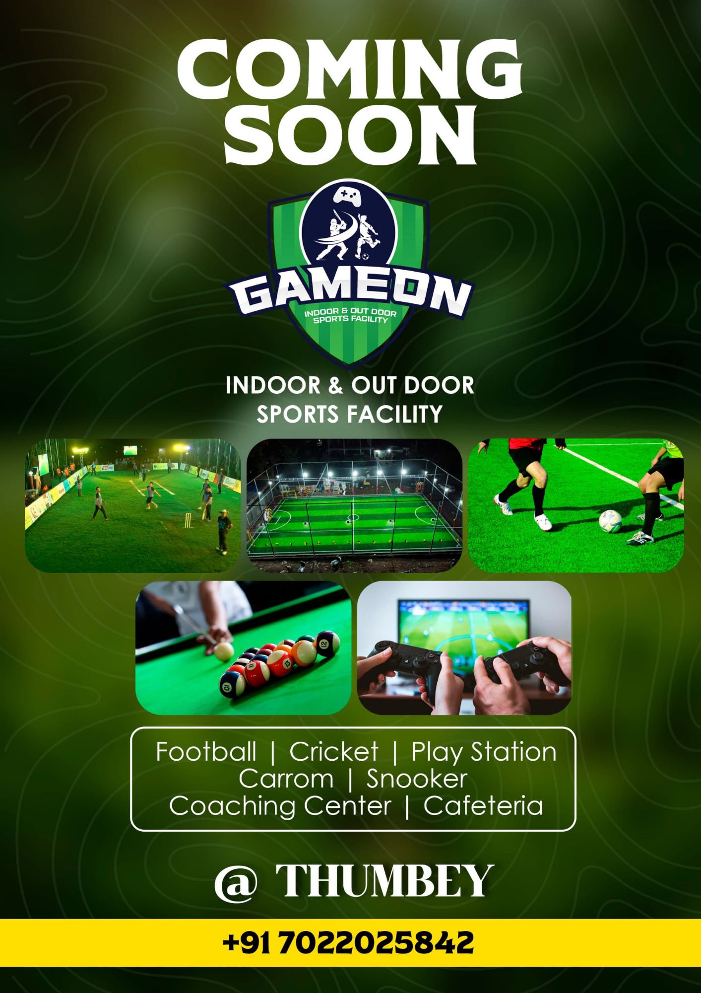 Gameon ಕ್ಲಬ್ನಲ್ಲಿ indoor ಮತ್ತು outdoor ಸ್ಪೋರ್ಟ್ಸ್ ಸೌಲಭ್ಯ ಕೂಡ ಇದೆ. ಇಂಡೋರ್ ನಲ್ಲಿ ಕ್ರಿಕೆಟ್ ಫುಟ್ಬಾಲ್ ಸಹಿತ ಯಾವುದೇ ಕ್ರೀಡೆ ಆಡಲು ವ್ಯವಸ್ಥೆ ಕಲ್ಪಿಸಲಾಗಿದೆ. ಅಲ್ಲದೆ, ಆಡಲು ಕ್ರೀಡಾ ಸಲಕರಣೆಗನ್ನು ನೀಡಲಾಗುತ್ತಿದೆ.